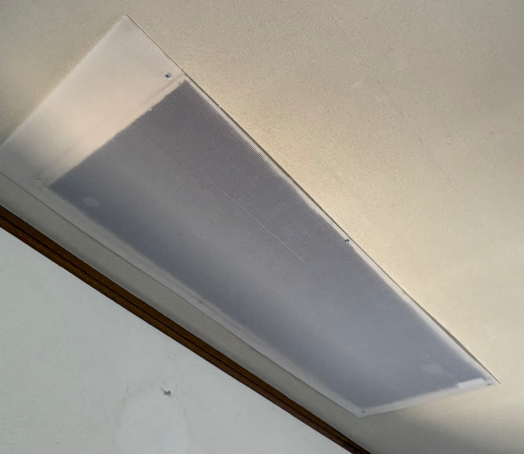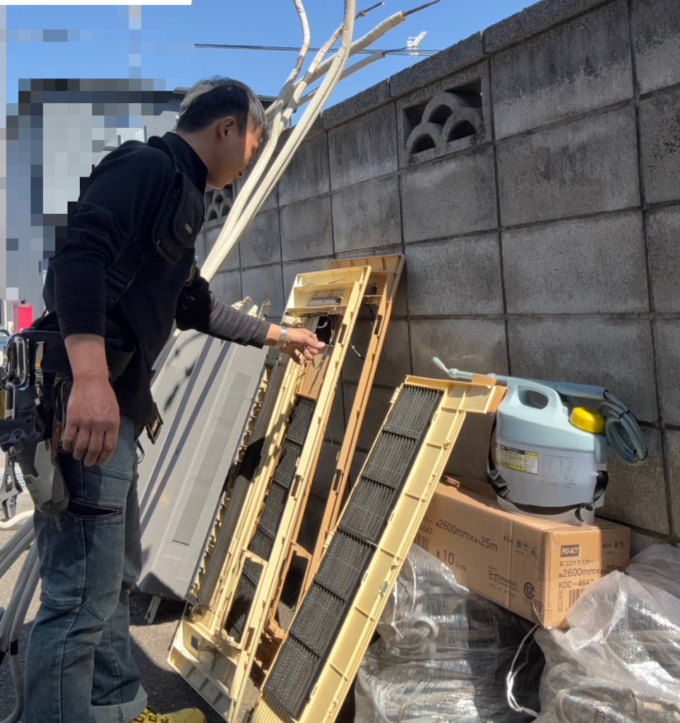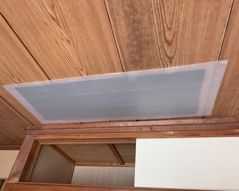 プラスチックベニヤを使用し、ホコリなどが落ちてくるのを防ぎエアコン風が逃げないよう養生をさせていただきました。