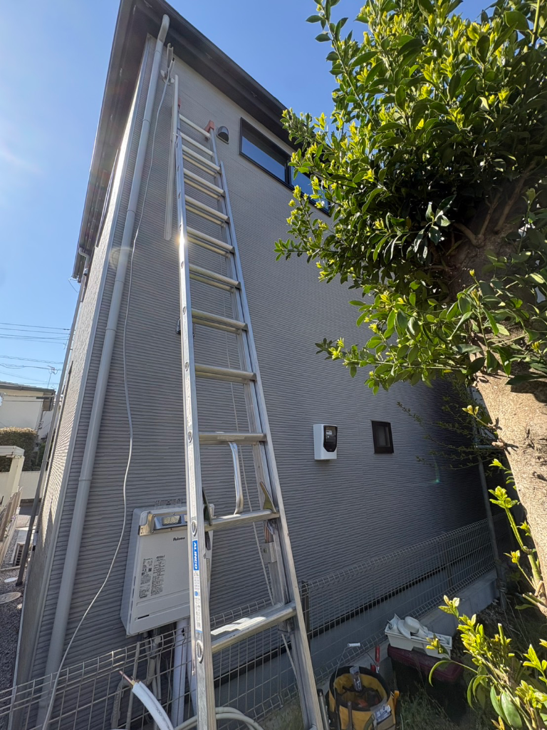 室内機は2階のお部屋で室外機は1階に設置の為ハシゴを使用しての作業となっております‼️