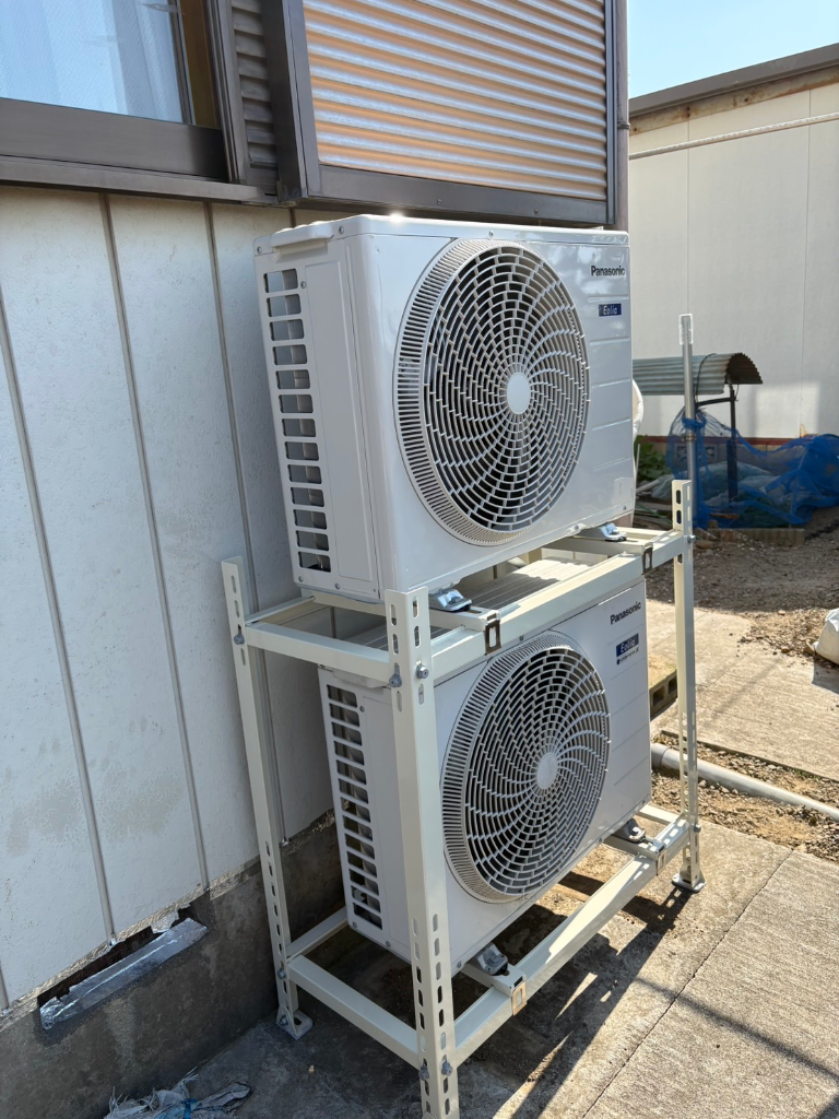 2段置き金具は別部屋の既存エアコンの室外機を乗せ替え、新設エアコンの室外機を上に設置させていただきました!