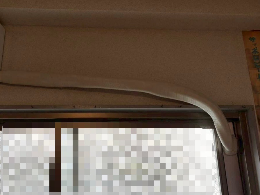 室内機が5階テナント、室外機が屋上となっており、窓パネルから配管を伸ばし外に出たところでドレンホースを分離し下へ。